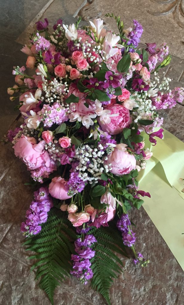 Bukett sommarmix med pion, kvistrosor, lövkoja, brudslöja med mera.
