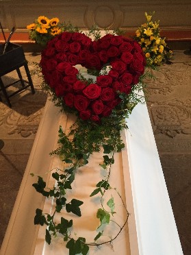 Öppet hjärta med röda rosor och murgröna som kistdekoration.
